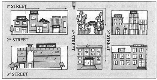 Sales clerk: Turn right at the book store. That’s 1st Street. Go straight to the traffic lights. Don’t turn. Walk straight again. Turn right at the park. That’s 5th Street.