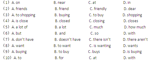 There is a big shopping mall ______ our school. There are many things in the mall. The people in it are very ______. On weekdays, we often go ______ things there on our way home. The shop opens at eight in the morning. It _______ at eight in the evening. We can buy ______ things in it. We can buy food, clothes, stationery ______ many other things. But ______any English books there.