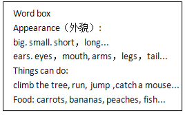 例:I am a monkey. My name is Coco. I am 4 years old. I have a big mouth, two small eyes and a long tail .My arms and legs are long .I like to eat peaches and bananas. I climb the tree.
