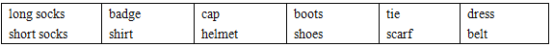 【題目】Listen, fill in the blanks about Beeno’s uniform.(6%) 聽,寫出Beeno穿的校服。