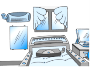 A: A brown sofa, a yellow table, a blue chair and a big TV.