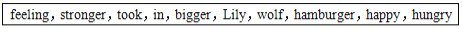 It was a fine day.Lily was very _________.She can see her grandmother again.She _________ the basket and put some food _________ it.On the way to her grandmother's house,she met a big bad _________.It was _________ than her.Its mouth was _________ than hers.The wolf wanted to eat Lily.But _________ is clever.She asked,“How's your _________?” “Very _________,of course.” “Look,I have a magic(神奇的)_________,you can fly after you eat it.” The wolf ate it and couldn't stop flying.Lily ran to her grandmother's place safely(安全地).
