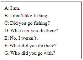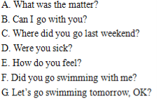 【題目】根據(jù)上下文,從所給的七個(gè)句子中選擇五個(gè)句子,將對(duì)話補(bǔ)充完整,并將該選項(xiàng)前面的字母編號(hào)寫(xiě)在相應(yīng)的橫線上。(10分)
