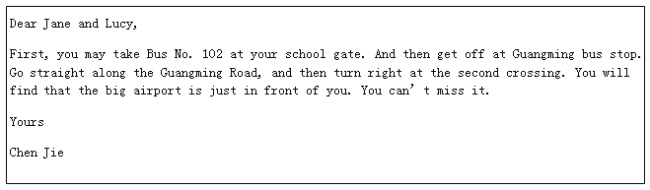 Jack and Lucy are going to take a plane to Beijing. But they don’t know how to get to the airport from their school to the airport. Chen Jie, write a note to show them the way to the airport.