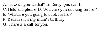 【題目】閱讀下面的對(duì)話,根據(jù)上下文,從所給的七個(gè)句子中選擇五個(gè)句子,將對(duì)話補(bǔ)充完整,并將該選項(xiàng)前面的字母編號(hào)寫(xiě)在相應(yīng)的橫線上。