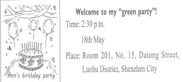 Ann livesDatong Street. Her birthday is on theof May. She will have a birthday. The party beginshalf past two in the afternoon. It is a “green party”! Green is Ann'scolour. Her friends can some green things to the party. It sounds interesting.