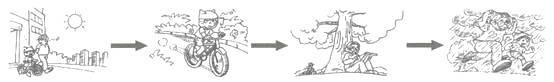 Today is Sunday. There's no school. It is sunny. Charlie and his father are going to the park. Look. Charlie is riding his bike. He is very happy. His father is sitting under a big tree. He is reading a newspaper. In the afternoon, the weather is bad. It is cloudy. Now it is raining. Charlie and his father have no umbrella. They are running home. But they forget their bike.