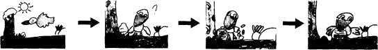 It is sunny and hot. A bird is thirsty. He wants to have some water. Then he can see a bottle. But the bottle is tall and thin. He can't drink the water. He's sad. He can see some little stones. And he has a good idea. He puts(~k) some little stones in the bottle. Look! He can drink the water now. He is not thirsty. He is happy.