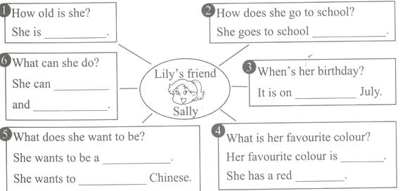 Hello, I'm Lily. I have a friend. Her name's Sally. She's eleven. Her birthday is on 10th July. She lives far from school. She goes to school by bus. Her favourite colour is red. She has a red hat. She can read and write. She is good at writing. She wants to be a teacher in the future. She wants to teach Chinese in a school.![]()