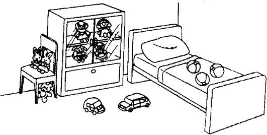 This is Mary's room. It's small. There is a cupboard(柜櫥) bthe bed. There are four dolls ithe cupboard. O the chair, there are two rabbits. The toy bear is u the chair. There are two toy cars on the . The three balls are on the bed.![]()