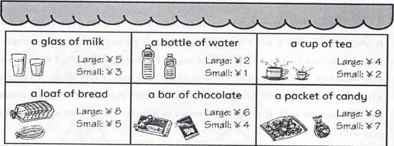 Mark is in theShop.Mark would like to have two small bottles of , apacket ofand two large bars of . They are 21 yuan.