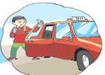 B: He lives in Sunshine Town. He goes to school by taxi.