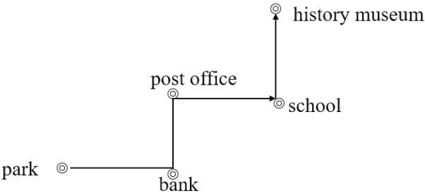 提示:他們在公園的前面,直走,在銀行處向左轉(zhuǎn),然后在郵局處右轉(zhuǎn),他們到達(dá)了學(xué)校的后面,再左轉(zhuǎn),走五分鐘就到了博物館。