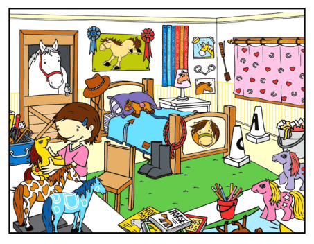 【5】The girl sits on the chair and plays with a toy horse. (______)