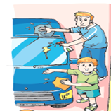 B: _________ __________ the car.