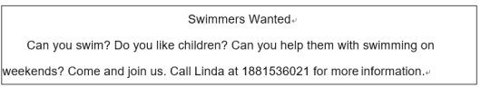 【3】Betty can swim well and she wants to find a job. Who can she call for more information? ( )