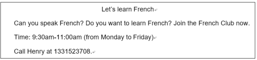 【5】Judy can speak French very well and she teaches children French. She works from Monday to Friday. Where does she work? ( )