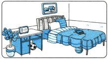 Hi, I'm Zhang Peng. This is my room.It's not big.You can see a small bed and a desk in it. There are two books and a clock on the desk.Beside the desk, there is a green plant.Above the plant, there is a picture of my grandparents' house.Look, what are those under the bed? Haha, they're a basketball and a football.I play basketball on Mondays and Thursdays,and I play football on Sundays.I really like sports.Is there a TV in my room? No! Mum says it's not good to watch TV in the bedroom.