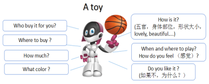 請根據(jù)以下思維導圖,挑選其中一兩項來寫5句話以上的英語句子來描述玩具機器人。有些問題不用按實際情況寫,例如誰買的,哪里買的,價格,這些都可以你自己編。
